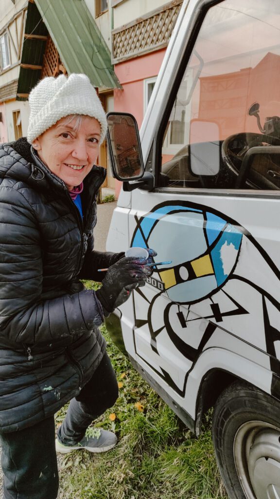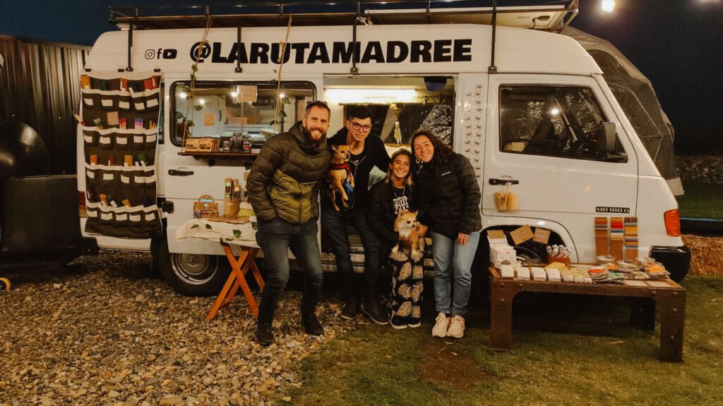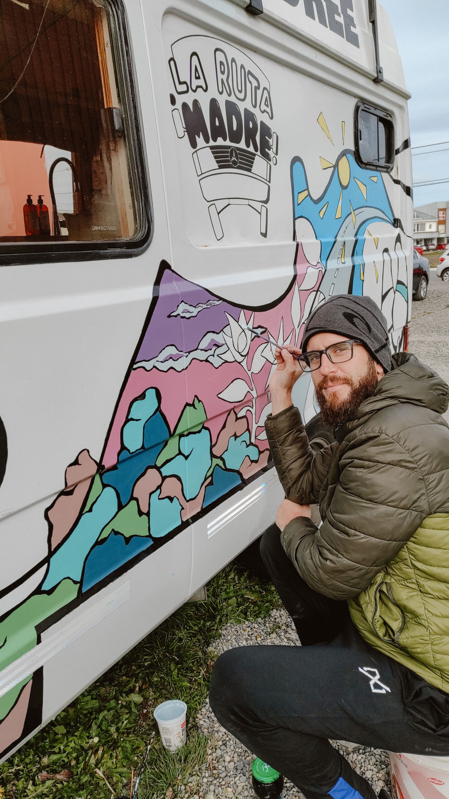 Andre no sólo nos llenó de cosas para vender en la feria: frascos, llaveros, imanes y cartelitos para decorar nuestro puesto móvil sino que encaró con valentía la enorme tarea que le dimos de diseñar un dibujo y pintar la Mechi de punta a punta. Arrancaba Abril y se venía al frío así que también era una carrera contra el tiempo. La idea era irnos apenas después del 2 de Abril cuando justo se cumplían 40 años del Día Nacional del Veterano y de los Caídos en la Guerra de Malvinas.