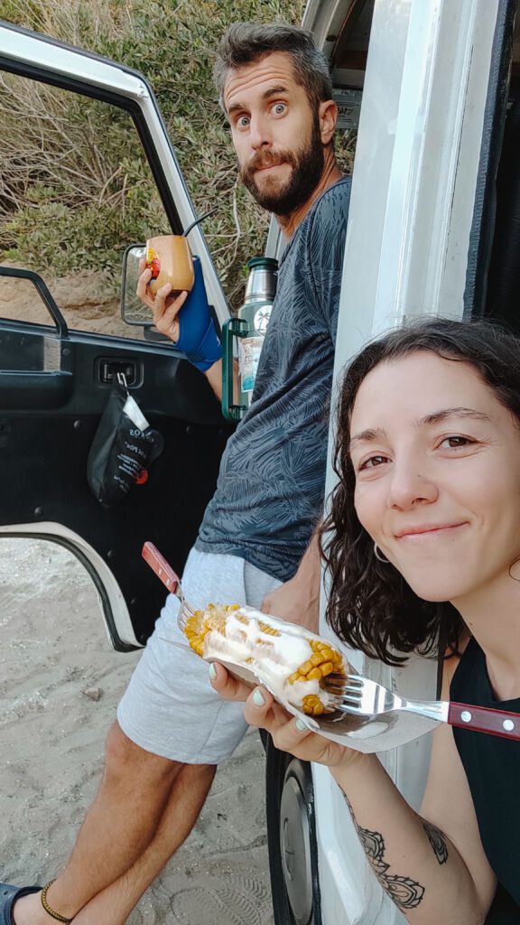 El viaje fue un éxito y la Mecha ya está estacionada frente al mar. Corremos hasta chocarnos con las olas, lloramos un poco y vamos derecho al primer puesto que vemos para comernos el mejor choclo de playa que alguien alguna vez haya comido. Nos miramos cada dos minutos y sonreímos, la sensación es de mucha MUCHA felicidad.