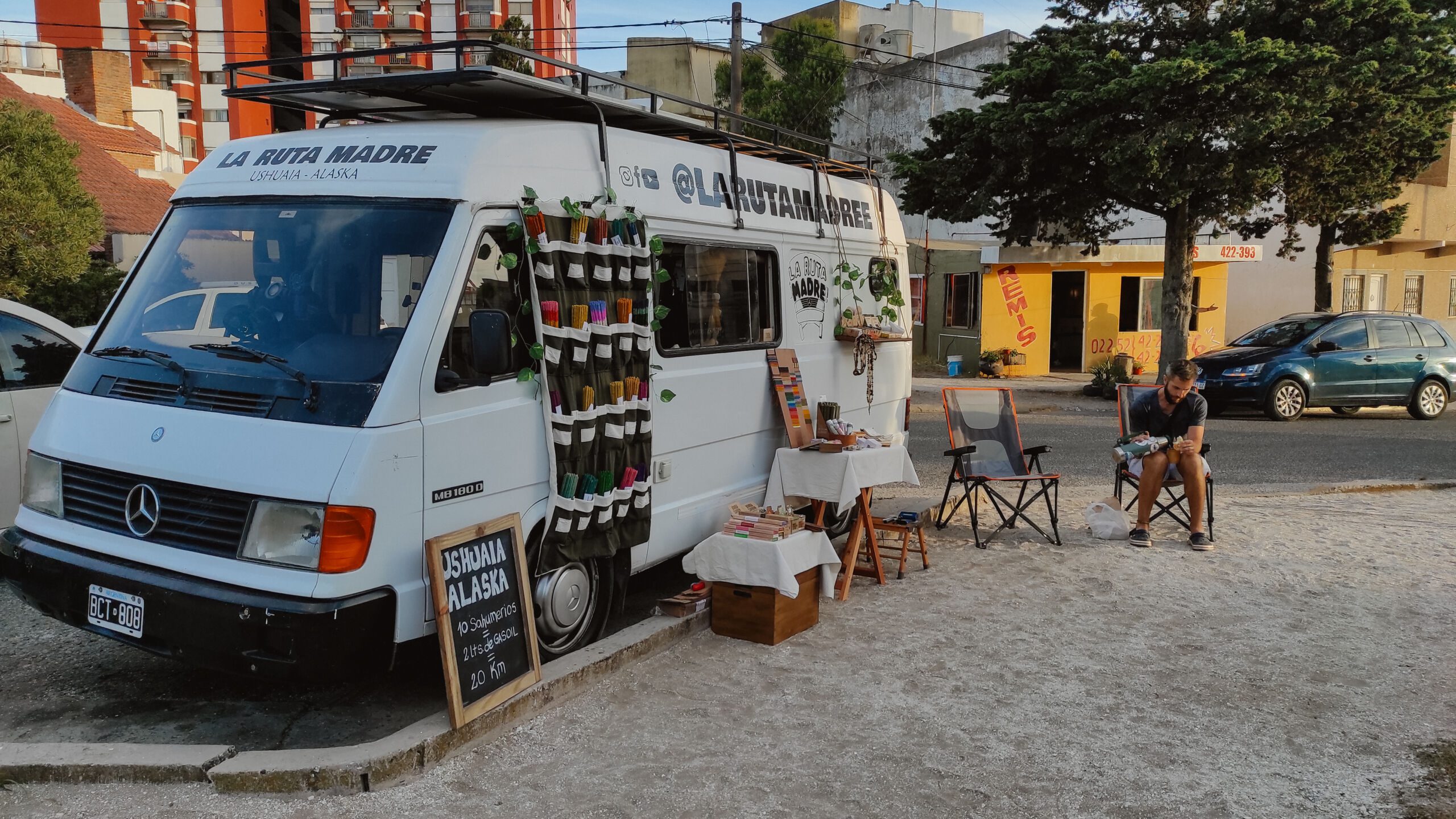 Para nuestro segundo día en San Clemente, encontramos un mejor lugar que fue nuestro dormitorio y oficina de trabajo por las siguientes tres noches de estadía en la ciudad. Estacionábamos justo al lado de una pequeña placita donde tres pibas armaban su circo callejero para entretener a los turistas del balneario. Enseguida pegamos buena onda con ellas que encima nos mandaban a su público a comprarnos artesanías y sahumerios a nuestra feria.